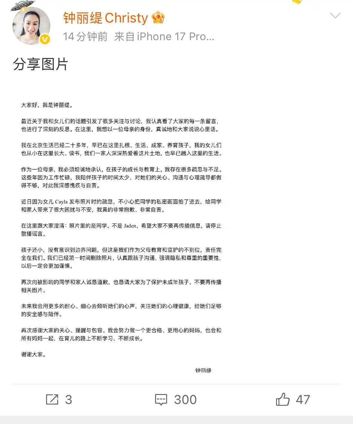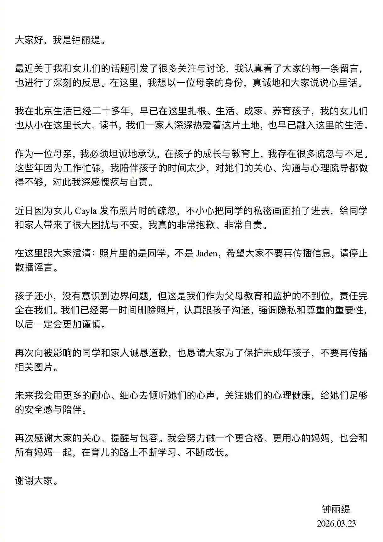 事件发酵后,钟丽缇也在第一时间赶紧发声道歉,称是自己教育失职,没有教好孩子,使得她做出没有边界感、且不尊重他人的事情。
