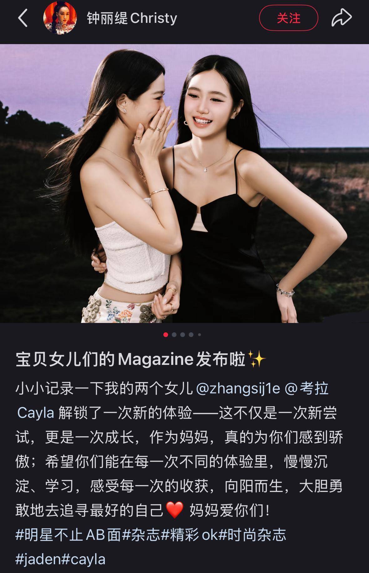 4月21日,钟丽缇在个人社交账号分享两个女儿Cayla和姐姐jaden拍摄写真的照片,钟丽缇表示:小小记录一下我的两个女儿解锁新体验的经历,这不仅是一次尝试,更是一次成长,作为妈妈,为你们感到骄傲。
